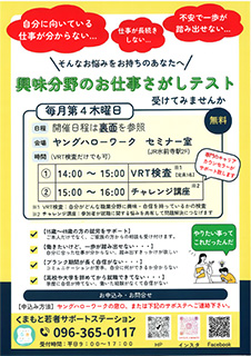 ハローワーク上益城にて月1回、VRT(職業興味テスト)&就労相談を行っています(予約制)。