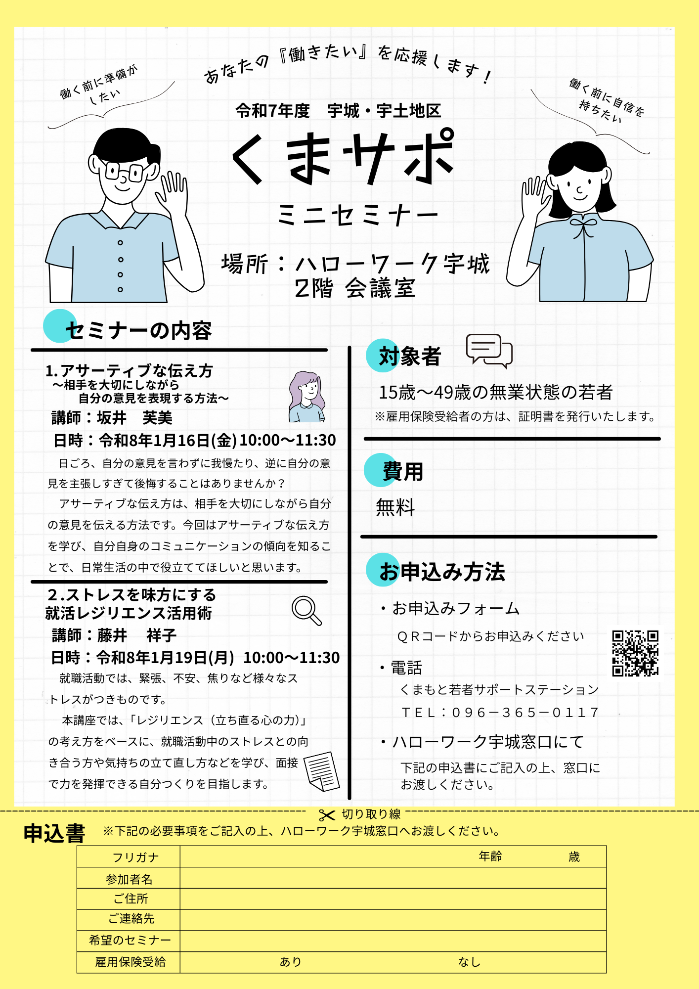 R8.1月16日(金)、1月19日(月)に宇城・宇土地区にて『くまサポミニセミナー』を開催いたします。場所は、ハローワーク宇城です。